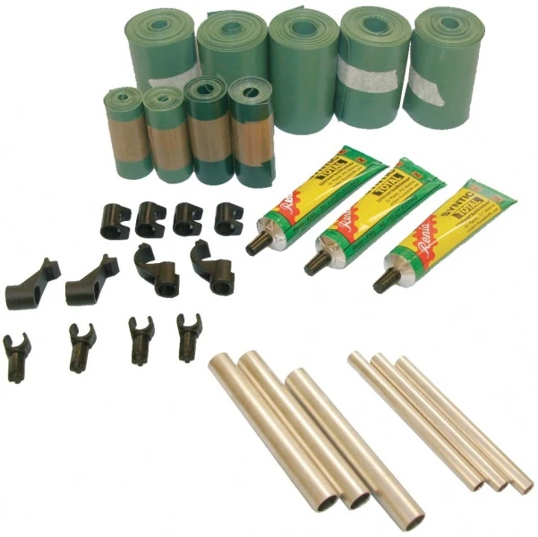 5 Rollen dünne Bootshaut (5,5 m × 10 cm), 2 Rollen dünne Bootshaut (1 m × 10 cm), 2 Rollen dicke Bootshaut (1 m × 10 cm), 3 Tuben Kleber 90 g, Diverse Verbindungsstücke und Spantenteile zur Reparatur.
