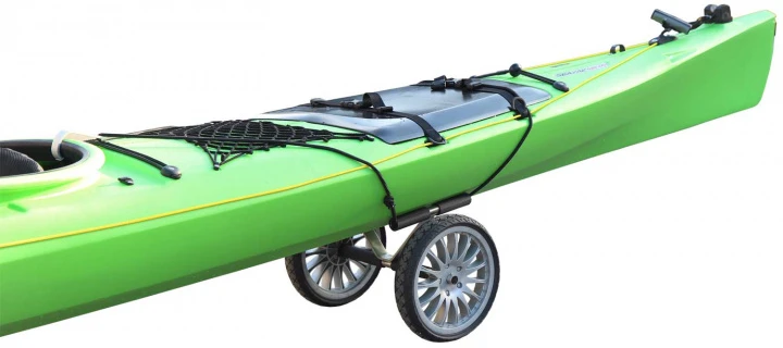 Einfach den Bootswagen von hinten unter das Kajak stellen, Gummileinen über das Boot spannen und den Haken am Cockpit einhängen!