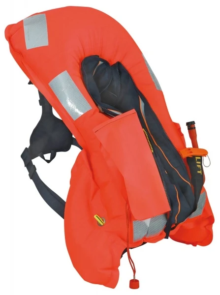DIN EN ISO 12402-3, Aufblasautomatik 3001S, CO2 Patrone 32 g, Auftrieb 160 N, ab 50 kg Körpergewicht.