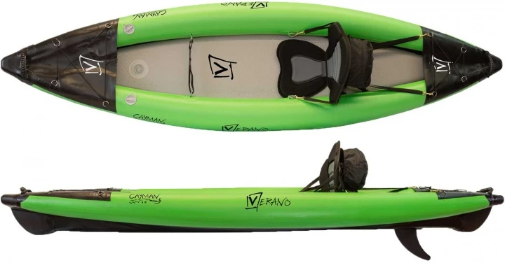 Das Verano Cayman Set besteht aus einem aufblasbarem Kajak mit komfortablem Sitz, Paddel, Packtasche, Pumpe, Reparaturset und Finne. Das Paddel ist 4-teilig mit Blättern aus Polypropylen (240 cm, 950 g).